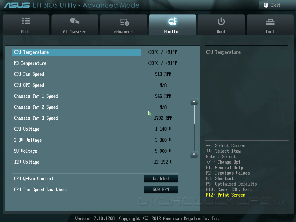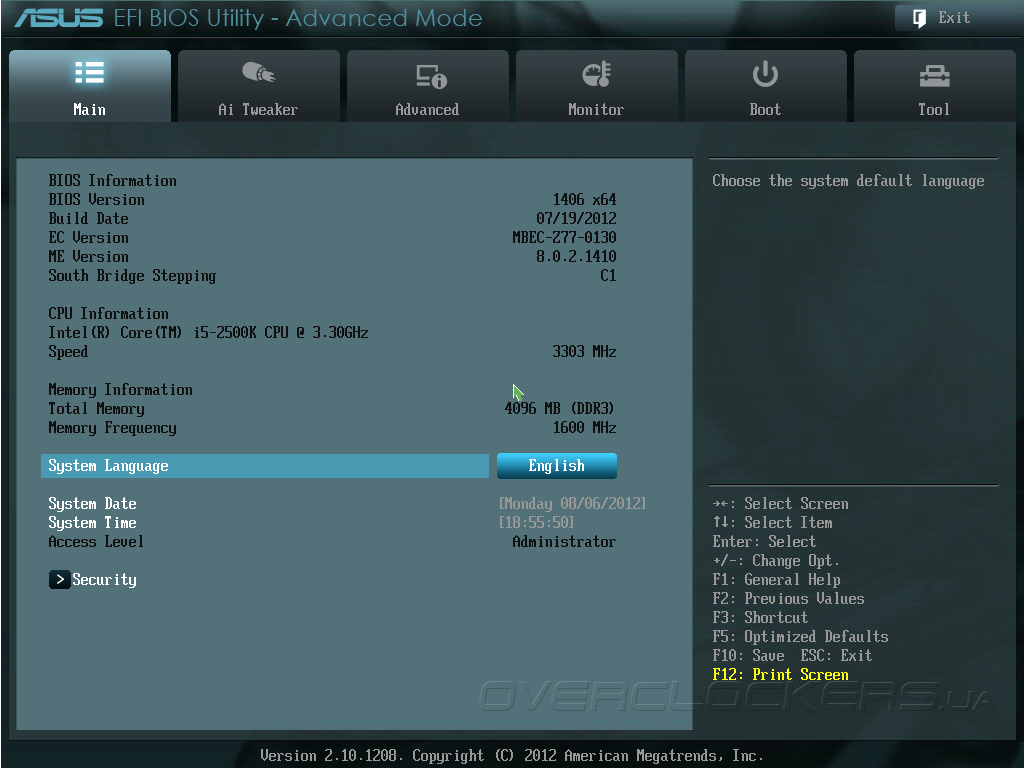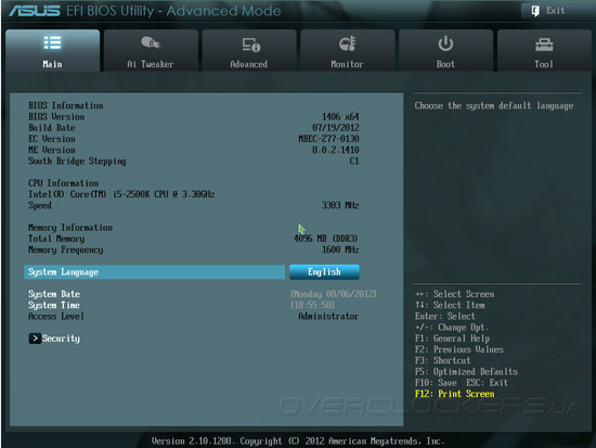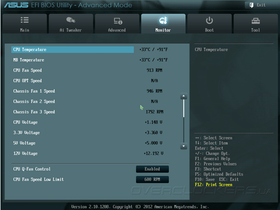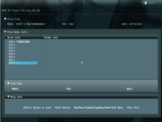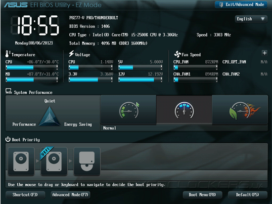 Прошивка системой платы ASUS P8Z77-V Pro/Thunderbolt основана на микрокоде AMI, как и в большинстве современных моделей вместо морально устаревшего BIOS применяется UEFI. Отличительной особенностью пользовательского интерфейса материнских плат ASUS является наличие режима EZ Mode, который позволяет контролировать основные параметры системы и управлять базовыми возможностями прошивки. Так, в главном окне EZ Mode отображаются текущие дата и время, краткая информация о версии прошивки, параметрах центрального процессора и модулей памяти. Здесь же выводятся показания датчиков системного мониторинга, находятся органы управления режимом энергосбережения и порядка инициализации загрузочных устройств.
