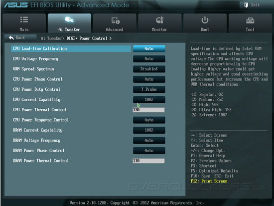 За многочисленные параметры цифровой подсистемы электропитания отвечает модуль DIGI+ Power Control, который позволяет настраивать работу функции Load Line Calibration, регулировать частоту переключения силовых элементов, задавать алгоритм отключения неиспользуемых каналов преобразователя напряжения и много другое.
