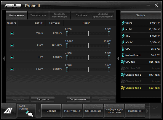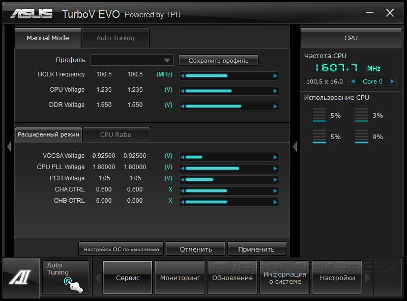 Для управления частотами, напряжениями и коэффициентами умножения вычислительных ядер служит «софтинка» TurboV EVO. Она же отвечает за активацию функции автоматического разгона. Несмотря на неплохие возможности, программа не лишена серьезного недостатка — пользователь не может управлять частотой и задержками модулей оперативной памяти.
