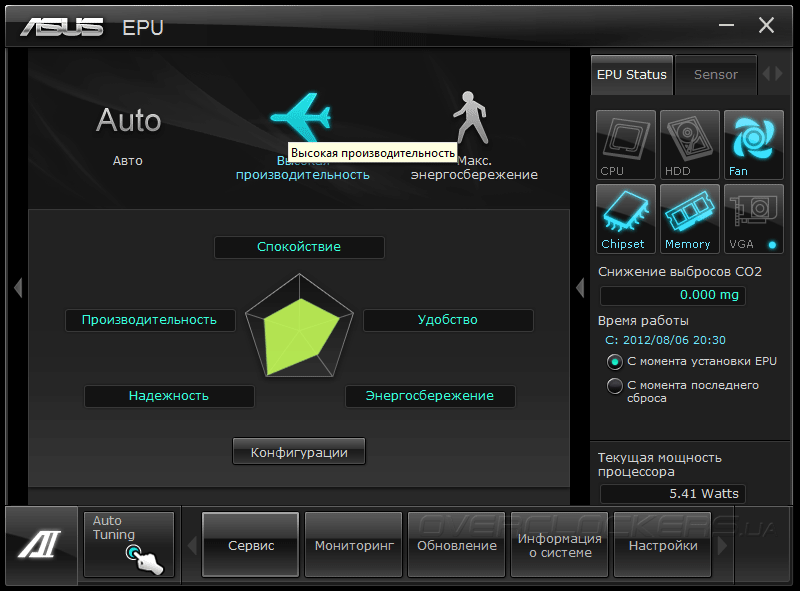 Настройки функций энергосбережения материнской платы собраны в программе EPU, которая не только позволяет задать профиль производительности, но также отображает текущую мощность, потребляемую центральным процессором и даже показывает снижение выбросов парникового газа СО2, полученную вследствие экономии электроэнергии.
