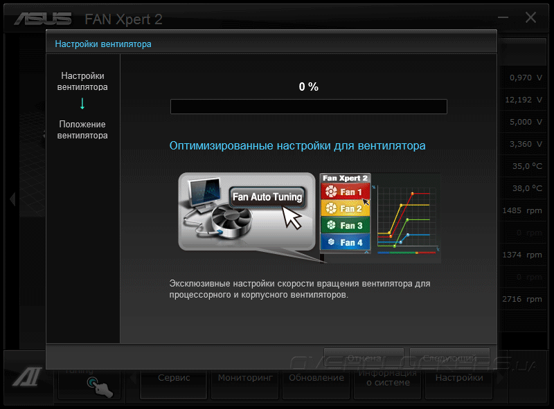Для настройки работы вентиляторов в составе ASUS AI Suite II есть модуль FAN Xpert 2. Вначале пользователю предлагается идентифицировать и откалибровать все установленные «карлсоны». После этого можно выбрать один из трех предустановленных профилей производительности или же вручную задать алгоритм управления в зависимости от температуры компонентов.