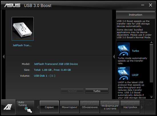 Для активации технологий ускорения универсальной последовательной шины служит утилита USB 3.0 Boost, которая позволяет задействовать режим UASP, обеспечивающий до 170% прироста скорости в сравнении со стандартным режимом. Увы, в тестовой лаборатории нет устройств, поддерживающих USB Attached SCSI Protocol, поэтому, мы не смогли проверить эффективность этой функции.