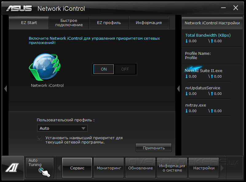 Наконец, в состав ASUS AI Suite II входит модуль Network iControl, отвечающий за управление сетевым подключением. Кроме счетчика переданных и принятых данных, а также задания приоритетов пропускной способности в зависимости от типа сетевого трафика, эта программа позволяет включить режим «ТСР без задержки», который позволяет снизить «лаги», мешающие игровому процессу в сетевых баталиях, а также автоматически поддерживать соединение PPPoE и многое другое.