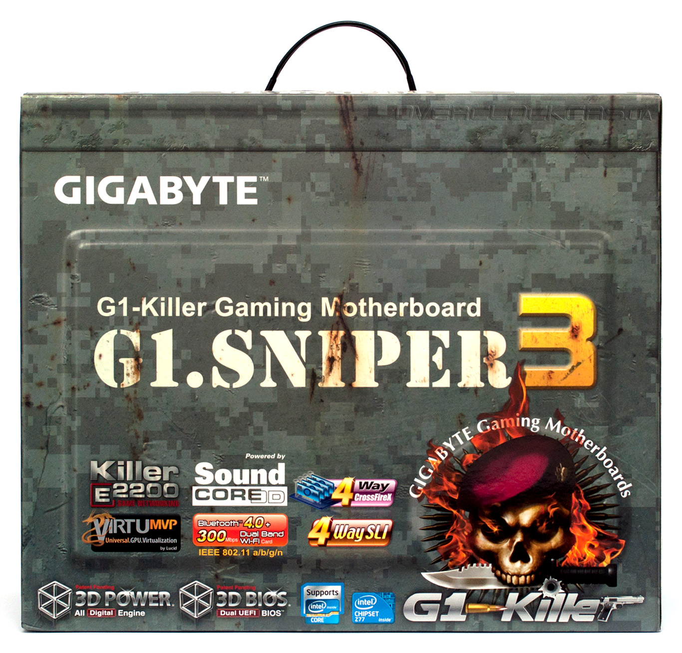 Как и подобает флагманской модели, Gigabyte G1.Sniper 3 поставляется в огромной коробке, которая, к счастью, снабжена удобной ручкой для переноски. Дизайн упаковки имеет милитаристический стиль. Действительно, издали коробка похожа на ящик для транспортировки и хранения боеприпасов, а череп в малиновом берете, который является символом серии G1-Killer, напоминает эмблему армейского подразделения специального назначения. Лицевая поверхность упаковки содержит название модели и логотипы многочисленных технологий, использованных в материнской плате Gigabyte G1.Sniper 3.