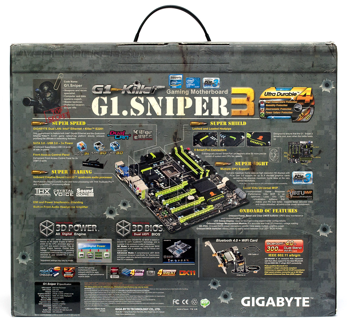 Обратная сторона коробки более информативна. Кроме краткой спецификации, пользователь может узнать о принадлежности платы к серии Ultra Durable 4, что означает применение конструктивных решений, обеспечивающих функционирование Gigabyte G1.Sniper 3 в условиях повышенных температур, защиту от статического электричества. Это достигается применением определенных схемотехнических решений и качественной элементной базы.
