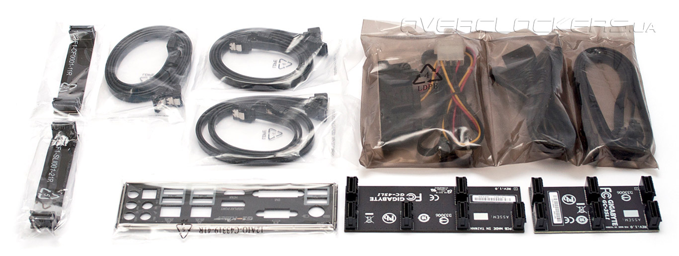Производитель позаботился о пользователях, планирующих построение систем NVIDIA SLI из нескольких видеокарт, и снабдил Gigabyte G1.Sniper 3 полным набором соответствующих мостиков. Еще в комплекте имеется планка, обеспечивающая вывод разъемов Power eSATA на заднюю стенку системного блока, а для удобства подключения двух устройств USB 3.0 есть панель, предназначенная для установки в свободный отсек 3,5”.