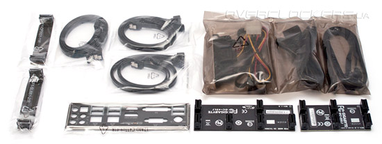 Как и подобает флагманскому продукту, материнская плата имеет разнообразный и многочисленный комплект поставки. В коробке находятся такие аксессуары: