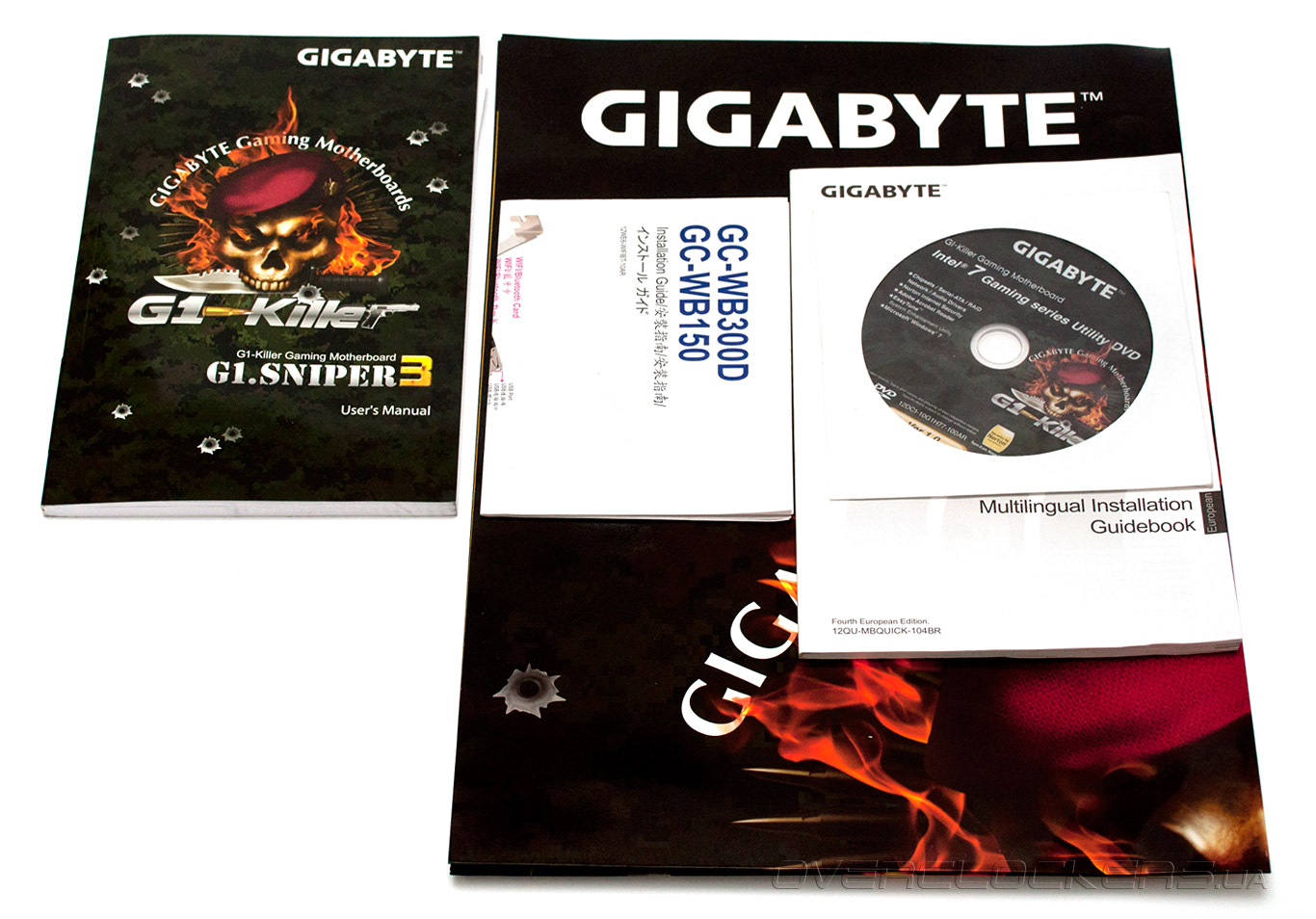 Кроме того, комплект поставки материнской платы включает руководство пользователя, инструкции по сборке системы и установке беспроводного адаптера, DVD-диск с программным обеспечением, а также плакат G1-Killer вместе с набором наклеек, имитирующих следы от пуль.