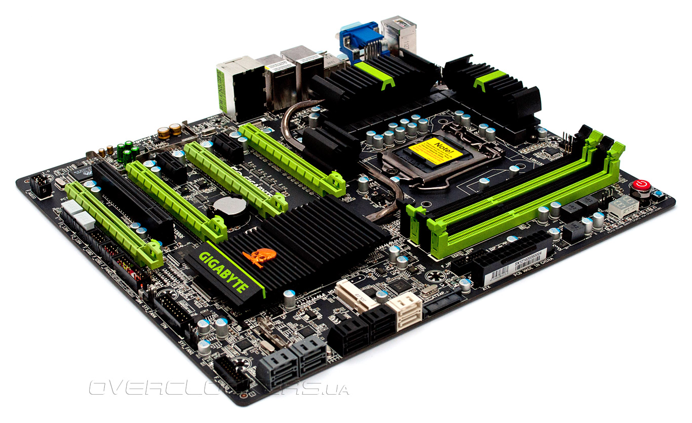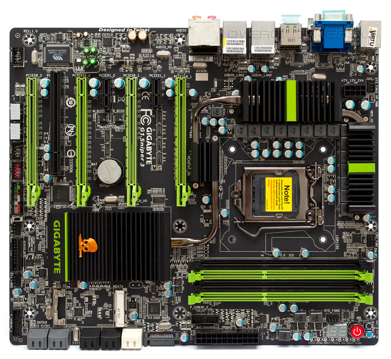 Материнская плата базируется на самом продвинутом «наборе» системной логики для процессоров Intel в исполнении LGA1155 — Intel Z77 Express. Этот чипсет предлагает наилучшую функциональность, среди которой можно отметить поддержку встроенной графики, наличие четырех портов USB 3.0, расширенные возможности дисковой подсистемы, а также полноценную возможность разгона процессоров с разблокированным коэффициентом умножения. Таким образом, плата совместима с любыми процессорами Intel Sandy Bridge и Intel Ivy Bridge. Конечно, часть специфических возможностей, таких как поддержка PCI-Express 3.0 или одновременный вывод изображения на три монитора, доступны только при установке 22-нм моделей. Gigabyte G1.Sniper 3 имеет четыре слота DIMM DDR3, в которые можно установить 32 Гбайт оперативной памяти. Модули ОЗУ могут работать на частоте до 2666 МГц включительно, но сам набор множителей зависит от модели установленного процессора.