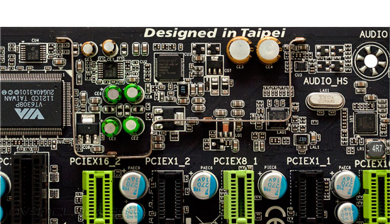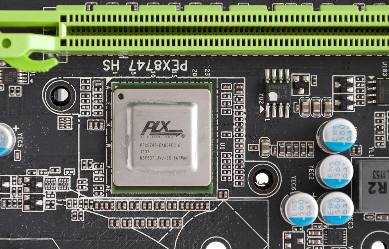 Данная микросхема выполняет функции коммутатора 48 линий PCI-Express 3.0, что особенно актуально при использовании новейших Intel Ivy Bridge. Для подключения к процессору используются 16 линий PCI-E, а оставшиеся 32 линии могут быть гибко сконфигурированы для обеспечения максимальной производительности связок Multi GPU. Благодаря наличию чипа PLX PEX8747 первый и третий по счету порты PCI-E x16 будут работать на полной скорости даже при установке пары графических укорителей. При использовании трех видеокарт следует задействовать первый, третий и четвертый слоты PCI-E x16, которые будут работать в режиме «х16+х8+x8». В случае установки четвертого графического акселератора все слоты будут обеспечивать работу видеокарт по схеме «х8+х8+х8+х8». Для установки плат расширения предназначены два разъема PCI-E 2.0 x1 и один PCI, последний реализован при помощи контроллера ITE IT8892E.