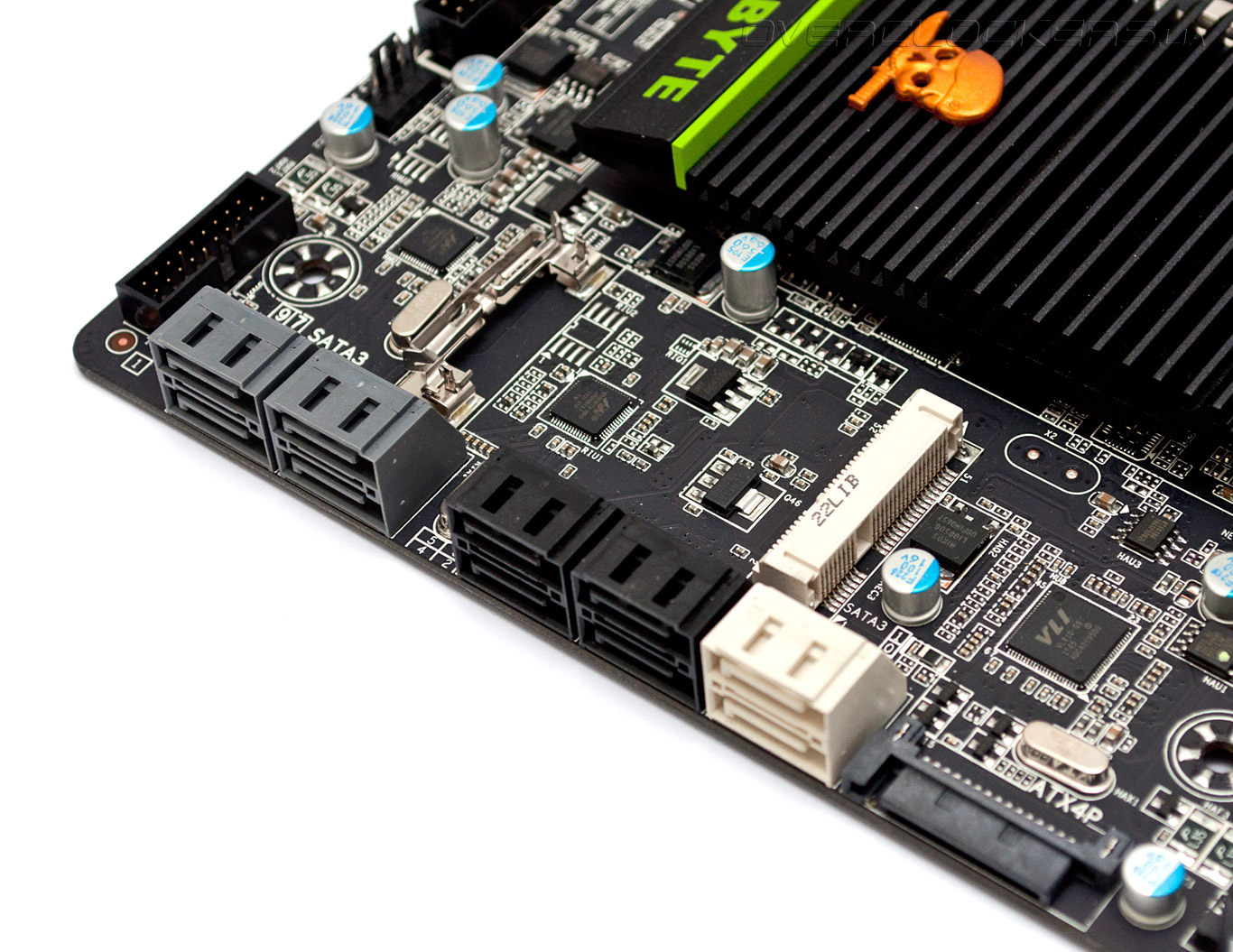 Рядом с портами SATA можно заметить разъем дополнительного питания ATX4P, который обычно используется для подачи напряжения на дисковые накопители. В данном случае, разъем предназначен для дополнительного электропитания разъемов PCI-Express 3.0 x16, производитель рекомендует задействовать его в случае организации связок из двух и более видеокарт.