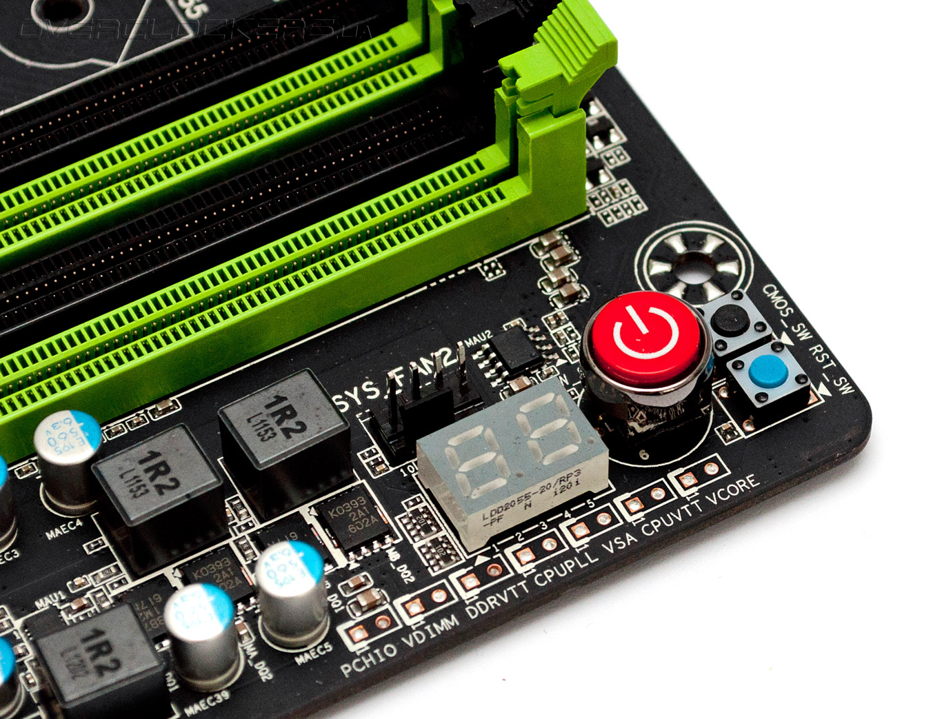 Для облегчения подбора оптимальных параметров системной платы в процессе разгона Gigabyte G1.Sniper 3 снабжена парой семисегментных светодиодных индикаторов, отображающих коды POST во время загрузки. В условиях работы открытого стенда пригодятся аппаратные клавиши включения и перегрузки, а также кнопка сброса настроек прошивки. Также стоит отметить наличие контактных площадок, предназначенных для подключения внешнего вольтметра. С их помощью можно контролировать основные напряжения, что может пригодиться в процессе экстремального разгона.