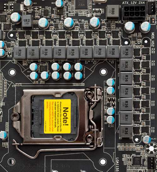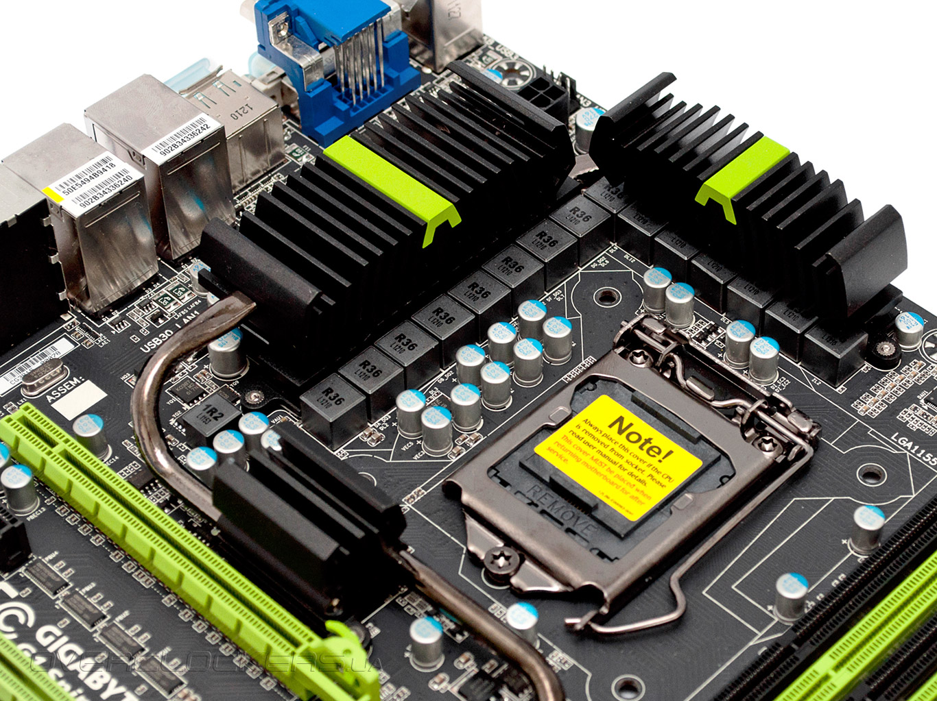 Рядом с процессорным сокетом можно заметить небольшой радиатор, который остужает пыл микросхемы PLX PEX8747. Отметим, что типичное тепловыделение чипа-коммутатор PCI-Express составляет 8 Вт, так что для его нормальной работы требуется охлаждение. Микросхема системной логики Intel Z77 Express имеет TDP 6,7 Вт, и для отвода избыточного тепла ей достаточно небольшого плоского радиатора.