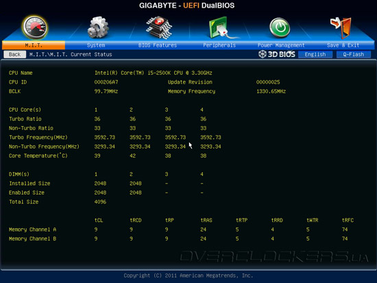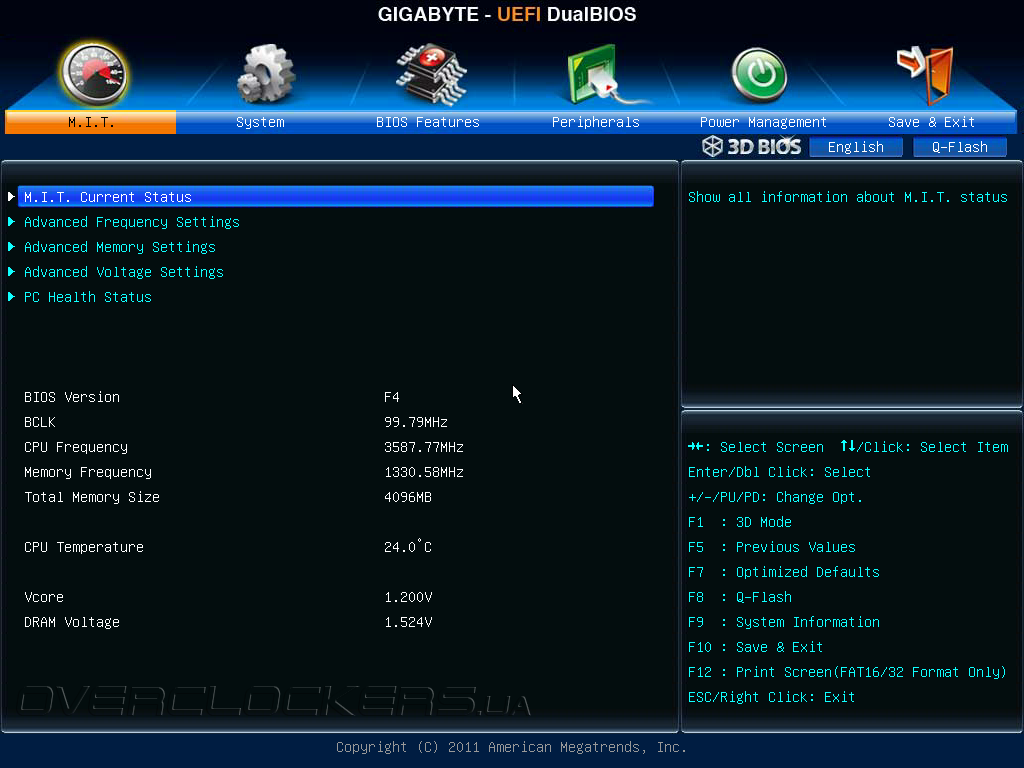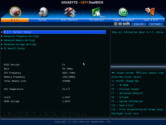 В целом, структура и наполнение меню настроек мало чем отличается от традиционного BIOS «материнок» Gigabyte. Все настройки, связанные с разгоном и оптимизацией быстродействия находятся в разделе M.I.T. — Mainboard Intelligent Tweaker, в котором, кроме ссылок на вложенные меню отображаются основные показатели состояния системной платы.