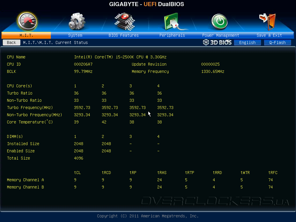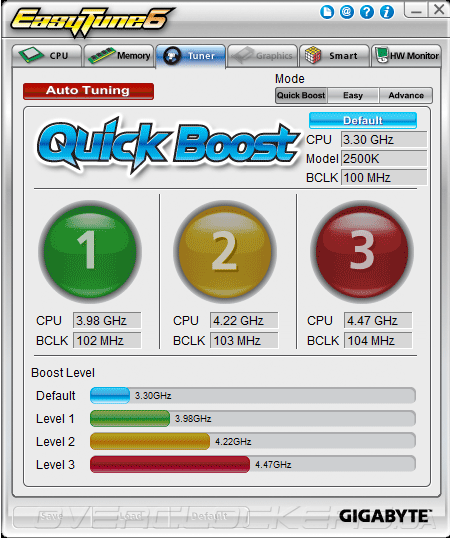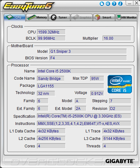 Так как материнская плата Gigabyte G1.Sniper 3 относится к флагманским моделям, мы ожидали от неё рекордного разгонного потенциала. Для проверки запаса прочности пришлось воспользоваться процессором Intel Core-5-2500K, так как на момент проведения тестирования Ivy Bridge не были доступны. Вначале мы проверили «интеллектуальные» способности материнской платы и эффективность автоматического разгона. Для этого мы воспользовались программой EasyTune6, выбрав один из предустановленных профилей быстродействия. После перегрузки и запуска системы частота центрального процессора составила 4225 МГц, для чего плата автоматически установила BCLK в 103,1 МГц при коэффициенте умножения равном 41. Модули ОЗУ работали на частоте 1649 МГц с задержками 10-10-10-25-1Т. Для обеспечения стабильности напряжение на вычислительных ядрах было повышено примерно на 0,1 В относительно номинала. Отметим, в режиме автоматического разгона все технологии энергосбережения продолжали исправно функционировать.