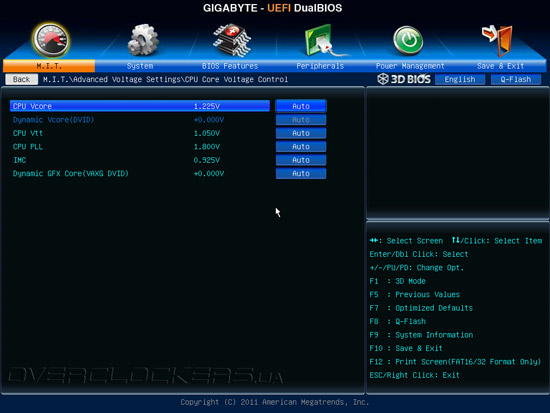 Тонкие настройки подсистемы электропитания можно найти в меню Advanced Voltage Settings, причем, параметры сгруппированы на трех вкладках: 3D Power Control, CPU Core Voltage Control и DRAM Voltage Control. Благодаря использованию продвинутого контроллера с цифровым управлением можно управлять режимом автоматического переключения питающих фаз, задавать время переключения между различными значениями Vcore, настраивать функцию компенсации падения напряжения Loadline Calibration отдельно для вычислительных ядер, встроенного графического ядра, шины оперативной памяти и напряжения CPU Vtt. К слову, параметр Loadline Calibration может принимать одно из значений: Extreme, Turbo, High, Medium, Low или Standard.