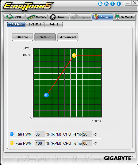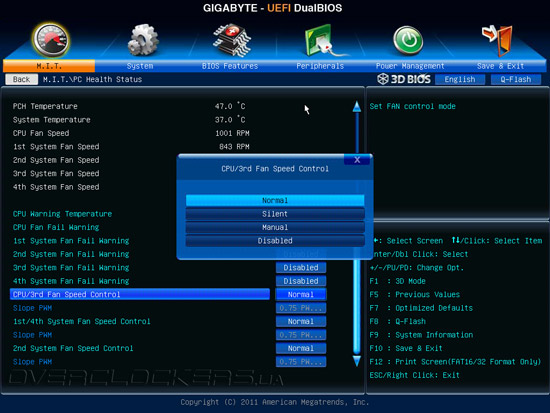 Прошивка материнской платы Gigabyte G1.Sniper 3 позволяет управления частотой вращения «карлсонов», причем, пользователь вправе выбрать один из трех предустановленных профилей или задать алгоритм работы вручную. Интересно, что настраивается работа только для трех каналов, при этом две пары разъемов управляются синхронно.