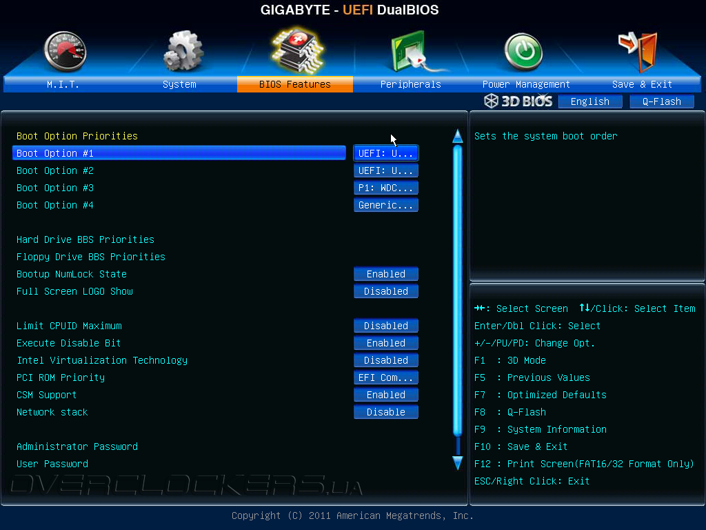 Раздел прошивки BIOS Features отвечает за установку параметров загрузки, настройки безопасности, а также активацию некоторых специфических функций, таких как аппаратная виртуализация и защита от вирусов, использующих ошибку переполнения буфера.