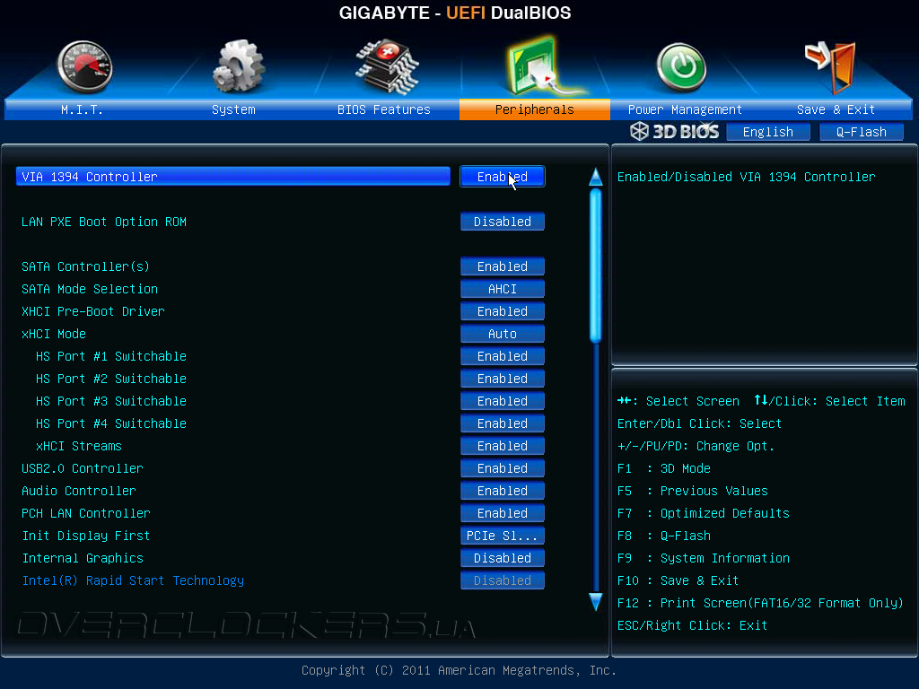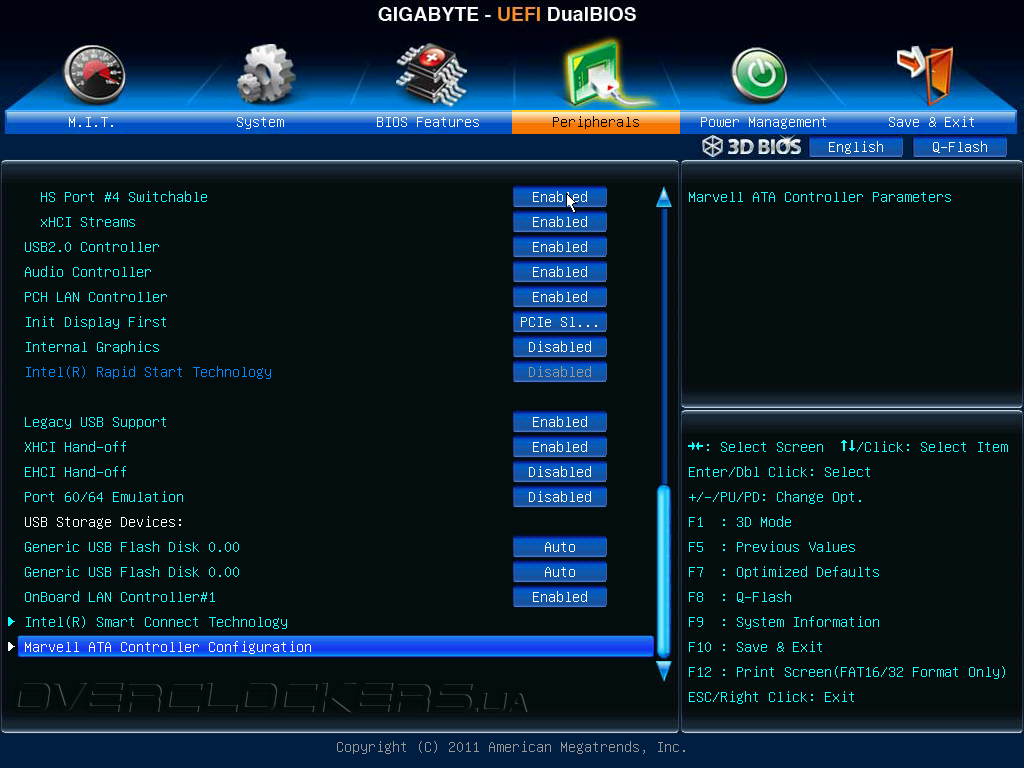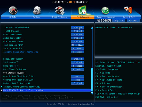 Все опции, связанные с работой графического ядра, функций расширения системной логики и многочисленных дополнительных контроллеров, находятся в меню Peripherals. Кроме прочего, именно здесь включаются технологии Intel Rapid Start и LucidLogix Virtu MVP.