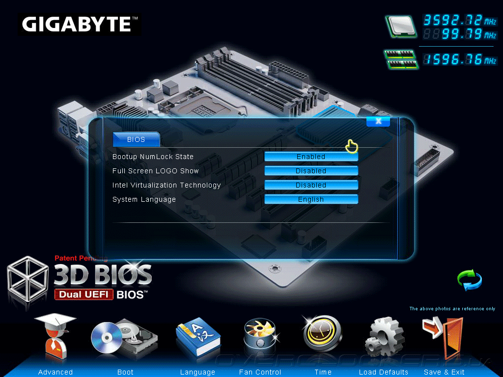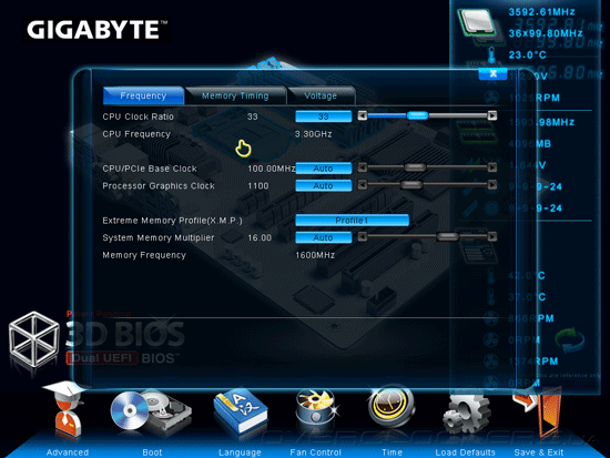 Долгое время материнские платы компании Gigabyte в качестве прошивки использовали традиционный BIOS, причем, один из его главных недостатков — невозможность полноценной работы BIOS с жесткими дисками объемом более 3 ТБ, был решен путем надстройки, обеспечивающей поддержку таблицы разделов GPT. Таким образом, отсутствие UEFI преподносилось как преимущество «старого доброго» решения над новомодным и непривычным графическим интерфейсом. Тем не менее, материнская плата Gigabyte G1.Sniper 3 получила прошивку, в основе которой лежит микрокод UEFI от American Megatrends Inc. (AMI). Уникальной особенностью графического интерфейса является режим 3D BIOS, позволяющий получить быстрый доступ к основным параметрам системной платы, а все тонкие настройки доступны в «Расширенном режиме».