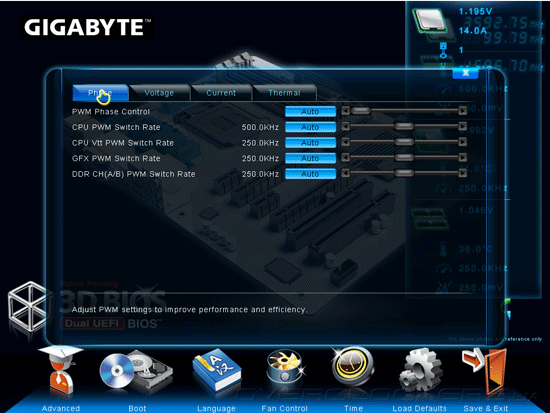 Наконец, вкладка Phase объединяет управления режимом переключения активных питающих фаз VRM, защитой центрального процессора и основных узлов материнской платы от превышения тока и перегрева.