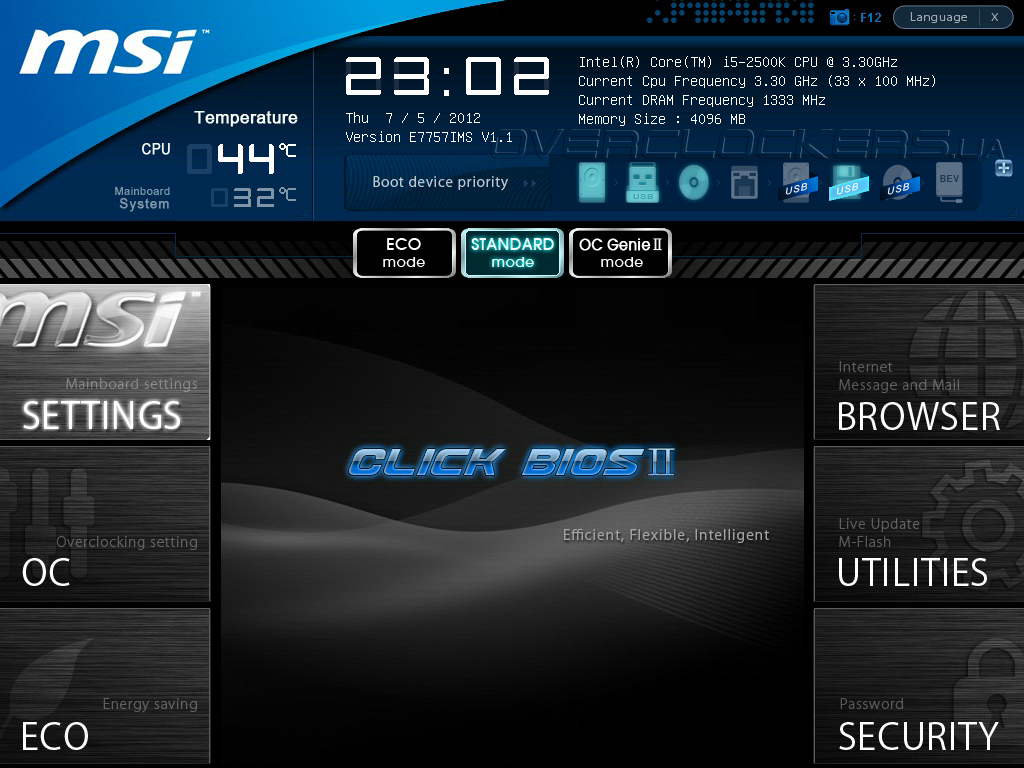 Компания MSI одной из первых внедрила UEFI в качестве прошивки для своих системных плат. Кроме очевидных преимуществ, таких как поддержка файловой таблицы GPT и расширенной поддержки различных устройств, меню настройки получило графический пользовательский интерфейс, который имеет собственное название ClickBIOS II.