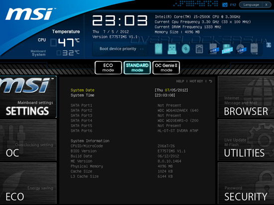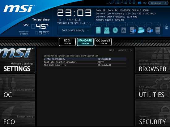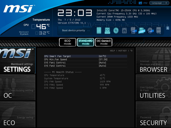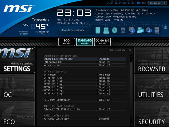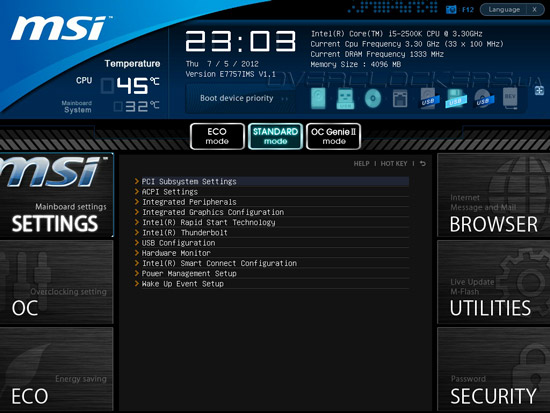 После входа в меню настроек пользователей встречает интерфейс, знакомый по другим моделям MSI. Все параметры сгруппированы в разделе, каждый из которых отвечает за те или иные функции материнской платы. В верхней части экрана отображаются температуры центрального процессора и системной логики, дата, время и версия управляющего микрокода. Там же выводится краткая системная информация об установленном процессоре и модулях ОЗУ, а также их текущие режимы работы.