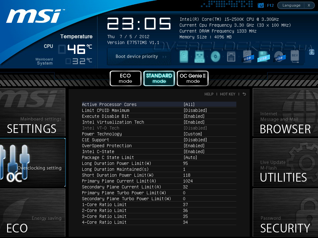 Все параметры, связанные с разгоном и быстродействием MSI Z77A-GD80, находятся в разделе OC — Overclocking settings. Именно здесь находится управление частотой BCLK, множителем центрального процессора и модулей ОЗУ, а также изменение настроек режима Intel Turbo Boost и технологии энергосбережения EIST.