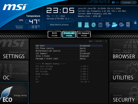 При помощи MSI Z77A-GD80 мы без особых проблем быстро достигли максимальной частоты 4800 МГц для тестового процессора. При напряжении Vcore 1,45 В и установке значения «100%» для опции Vdroop Offset Control наш Intel Core i5-2500K без сбоев проходил длительное стресс-тестирование в LinX. При этом оперативная память работала на частоте 1866 МГц при задержках 9-9-9-28-1Т.