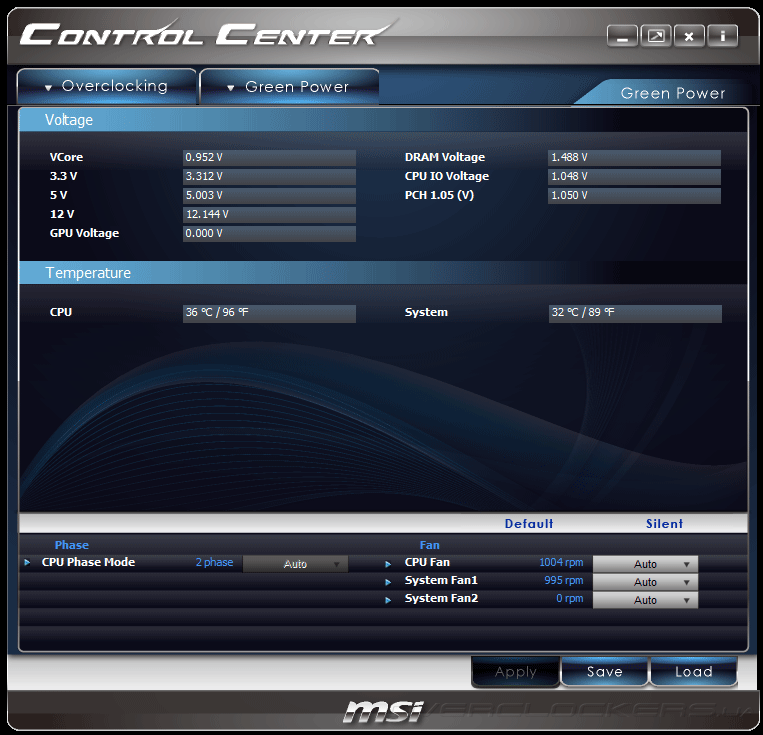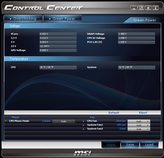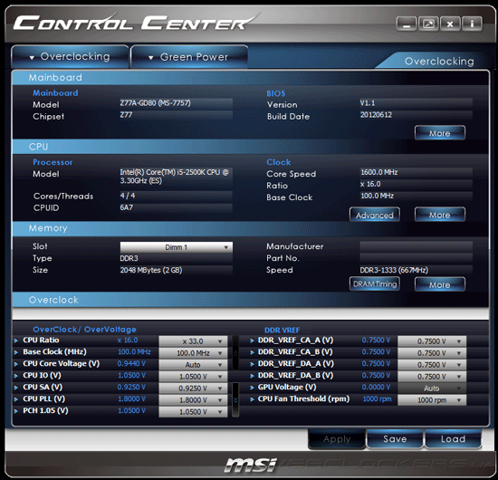 Вторая полезная утилита, идущая в комплекте с Z77A-GD80 — MSI Control Center, позволяет управлять основными параметрами «материнки» в режиме реального времени. Основные возможности программы разбиты на две группы: Overclocking и Green Power. Как следует из названия, в первой группе сосредоточены настройки частоты BCLK, множителей центрального процессора, таймингов ОЗУ и напряжений питания.