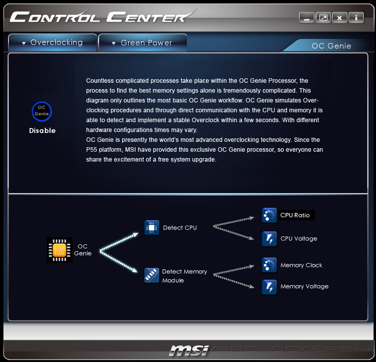 Кроме ручных настроек программа имеет режим автоматического разгона OC Genie, который позволяет получить прирост производительности пользователям, не желающим разбираться в премудростях оверклокинга.