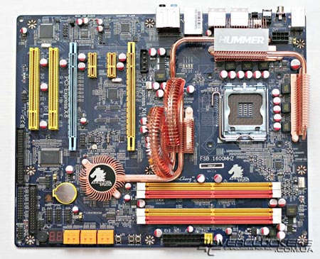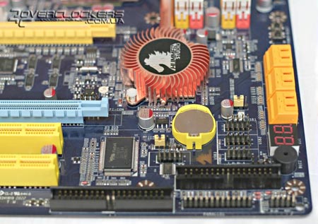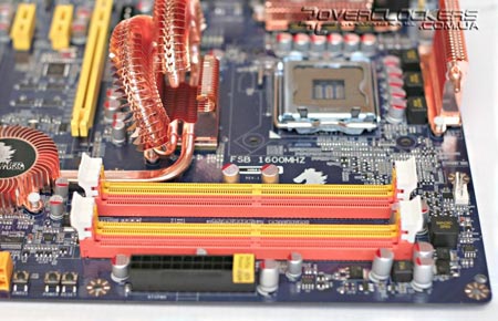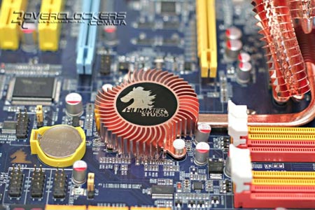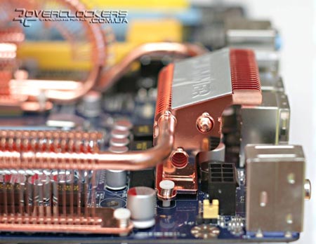 На северном мосте P45 установлен самый большой радиатор из четырех имеющихся на плате. По форме он напоминает конструкцию системы Circu-Pipe, которую устанавливает на свои продукты компания MSI. Если планируется установка видеокарты с пасивной системой охлаждения на обратной стороне карты, то есть вероятность не совместимости данных решений.
