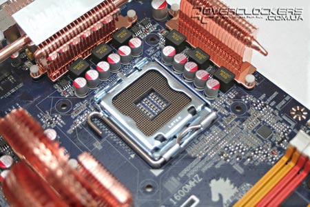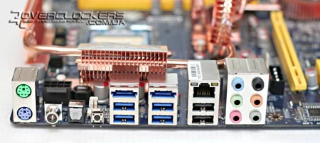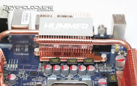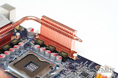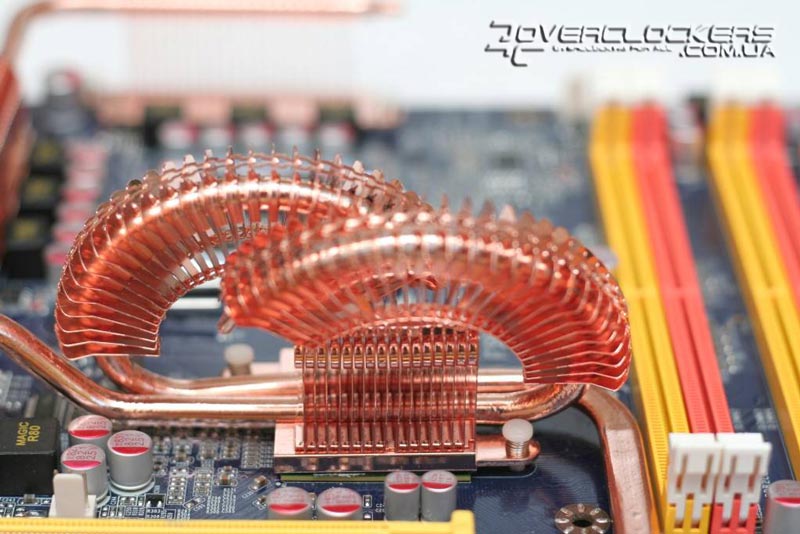 На всех MOSFET'ах расположено два радиатора, соединенных между собой тепловой трубкой. Наличие охладителей на силовых элементах позволяет повысить эффективность охлаждения полевых транзисторов, и, как мы уже успели упомянуть, такие радиаторы в основном встречаются на платах высшей ценовой категории, которые позиционируются как продукты для экстремального оверклокинга. Но учитывая предельную рабочую температуру таких элементов в 120 °C, радиаторы для MOSFET нередко вызывают множество споров об их целесообразности.