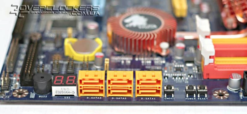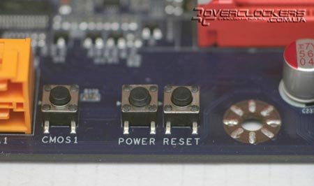 И под конец самое интересное. Рядом с SATA-коннекторами можно обнаружить кнопки Power, Reset и даже Clear CMOS, которые упрощают будни оверклокера. А наличие встроенного POST-индикатора и спикера трудно недооценить, особенно энтузиастам.