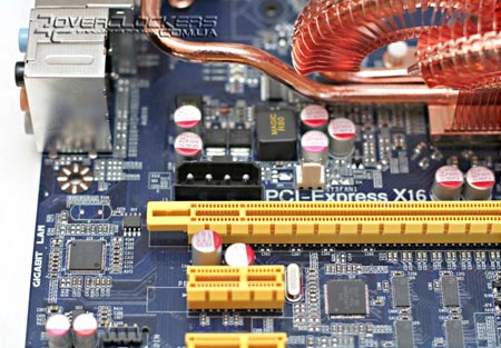 Также возле первого слота PCI-E x16 расположен разъем типа Molex, который обеспечит дополнительным питанием пару видеокарт, объединенных в режиме CrossFire.