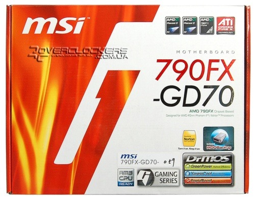 MSI 790FX-GD70 поставляется в большой массивной коробке, выполненной в красно-белых тонах, ставших в последнее время традиционными для компании.