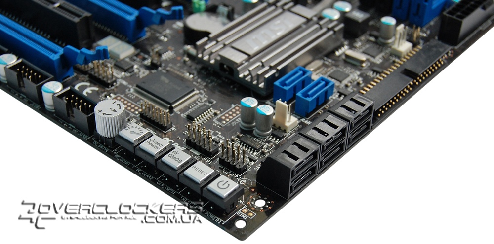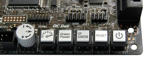 Как и положено модели high-end уровня, у MSI 790FX-GD70 имеются кнопки включения/перезагрузки и обнуления настроек BIOS прямо на плате. Рядом с ними еще имеются кнопка активации энергосберегающего режима Green Power, оверклокерской функции OC Dial и ручка-регулятор для разгона, позволяющая повышать частоту тактового генератора с шагом, заданым в BIOS Setup.
