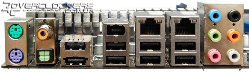 На заднюю панель, кроме стандартных двух PS/2 и шести аудиоразъемов, вынесены семь USB, один спаренный eSATA/USB, один порт FireWire, два порта Ethernet, а так же цифровой и оптический S/PDIF.