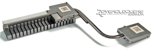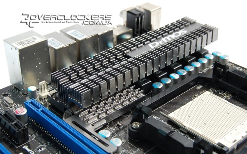 Охлаждение платы представлено довольно массивным радиатором на чипсете AMD 790FX и силовых элементах подсистемы питания, который соединяется тепловой трубкой с радиатором южном моста. Вся эта конструкция крепится к плате шестью винтами с пружинами.