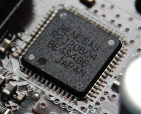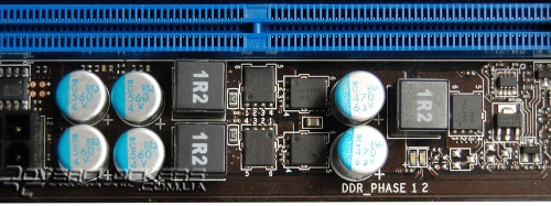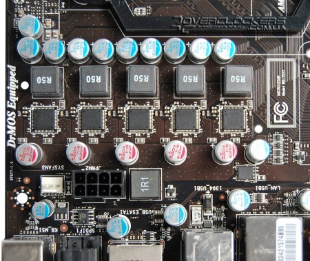 Данная плата выполнена по технологии DrMOS (Driver MOSFET), поэтому в цепи питания вместо обычных транзисторов применяются сложные интегральные преобразователи напряжения Renesas R2J20604 японского производства, сочетающие в одном корпусе два транзистора и управляющий ими драйвер. Подобные преобразователи обладают очень высоким КПД и невысоким уровнем тепловыделения. Кстати, последнее преимущество, согласно данным с сайта производителя, составляет целых 30% относительно традиционных схем с дискретными полевыми транзисторами. Технология DrMOS повышает стабильность работы при разгоне и улучшает энергоэффективность работы всей схемы при минимальной нагрузке. Управление системой питания осуществляется контроллером L6740L от STMicroelectronics.