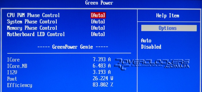 В меню Green Power раздельно регулируется APS для системы питания процессора, памяти, северного моста. Есть возможность просто отключить индикацию без деактивации функций энергосбережения. В этом же разделе BIOS отображается информации о токе, которые потребляют CPU и NB, ток потребляемый по линии 12 В и общая потребляемая системой мощность.