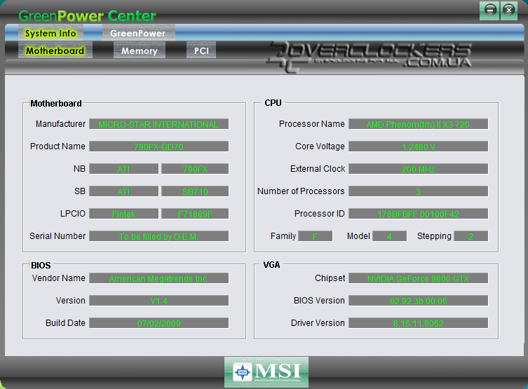 На двух фирменных утилитах GreenPower Center и Overcloking Center остановимся чуть подробнее. Первое приложение, как следует из названия, предназначено для управления энергосберегающими функциями (а кроме этого предоставляет еще и полную информацию о самой плате, установленных модулях памяти и платах расширения).