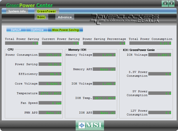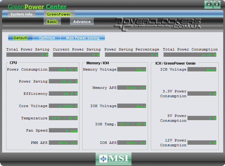 Непосредственно во вкладке управления GreenPower есть два режима — Basic и Advanced. В первом случае мы лишь выбираем один из трех профилей: в Default работает обычная технология Cool’n’Quit, в Optimize задействован весь спектр возможностей платы (в том числе технология APS), а в MaxPowerSaving частота процессора просто поддерживается на минимуме независимо от нагрузки (при минимально допустимом множителе 4 это 800 МГц).