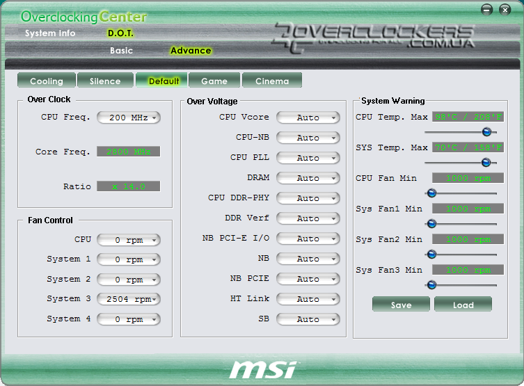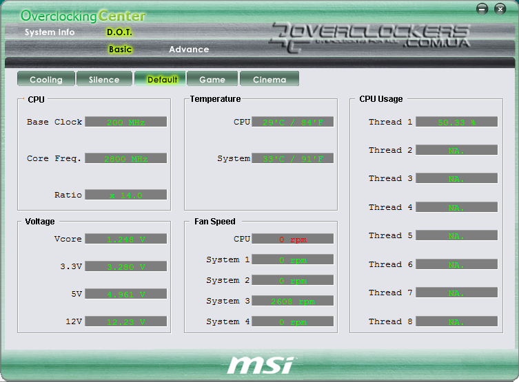 Во вкладке D.O.T. имеется пять профилей, которые активируются в зависимости от загрузки CPU. Каждый из профилей настраивается в разделе Advance. Здесь пользователь может менять частоту тактового генератора, напряжения (все те же 11 параметров, доступные в BIOS) и скорость оборотов вентиляторов. Таким образом, для каждого из режимов можно сохранить различные настройки частоты процессора. Например, для режима Silence (в случае очень низкой загрузки) можно выставить CPU на минимум при минимальных оборотах вентилятора, а стоит загрузить систему на максимум, как у нас включится режим Game, в котором уже будет не лишним и разгон.