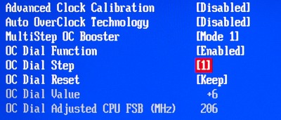 Для использования «ручного» разгона с помощью регулятора вначале необходимо активировать данную возможность, включив OC Dial (с помощью соответствующей кнопки на плате), в BIOS Setup для него устанавливается значение от 1 до 10. Единица соответствует +6 МГц тактового генератора (в реальности 7 МГц), что дает прирост частоты CPU почти 100 МГц, соответственно при установке OC Dial Step в 2 частота тактового генератора повышается на 14 МГц, а процессора на 200 МГц.