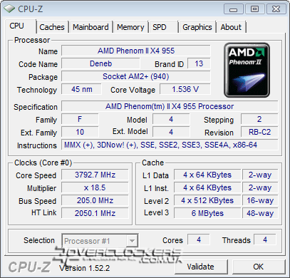 Phenom II X4 955 тоже порадовал высокими показателями разгона, причем на отметке в 3793 МГц пришлось остановится лишь из-за перегрева процессора в тяжелых приложениях на более высоких частотах. CPU положительно реагировал на дальнейшее повышение напряжения и запускался даже на 3850 МГц, но в таких условиях кулер Thermalright Ultra-120 eXtreme с ним не справлялся несмотря даже на высокопроизводительный вентилятор 2400 об/мин.