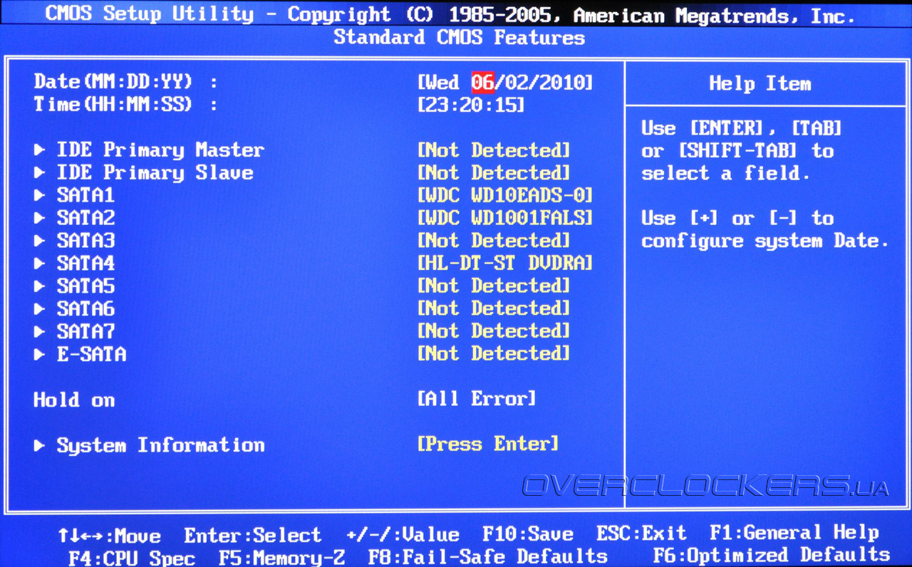 Раздел Standard CMOS Features позволяет настроить дату/время, просмотреть информацию о системе, а также настроить некоторые параметры накопителей.