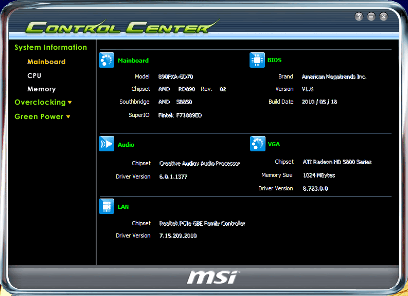 Теперь, когда мы с вами рассмотрели богатые возможности по настройке BIOS, переходим к изучению комплектного ПО. Реалии сегодняшнего дня таковы, что без достойной поддержки со стороны программного обеспечения даже самые удачные продукты обречены на неудачу. Но программисты MSI постарались, и на диске, которым комплектуется материнская плата, присутствует отличный программный комплекс для управления и мониторинга системной платы — Control Center. Все опции данной утилиты сгруппированы по категориям: системная информация, разгон и мониторинг.