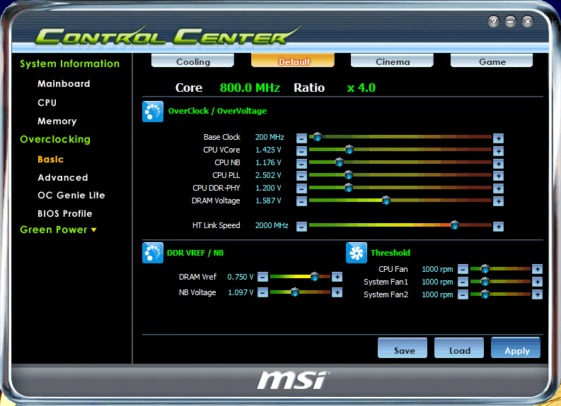 С помощью программы Control Center пользователь может менять базовою частоту, частоту шины НТ и все основные напряжения. Кроме того, доступна ручная регулировка скоростей вращения трех из пяти вентиляторов. Вкладка Advanced предлагает изменение таймингов ОЗУ прямо из среды операционной системы. Кроме того, в разделе Overclocking есть предустановленные профили, предназначенные для настройки системы «в одно касание» и ориентированные на применение компьютера в качестве медиацентра (профиль Cinema) или игровой станции (профиль Gaming). OC Genie lite работает в том случае, если активирована соответствующая функция в BIOS материнской платы. Увы, мы так и не смогли проверить ее работу. После активации этой опции в BIOS, плата отказывалась стартовать — оживить её удавалось только нажатием кнопки CLR_Cmos. Выбор опции BIOS Profile вызывал ошибку и приводил к краху программы Control Center. Возможно, в ее обновленных версиях эта досадная ошибка будет исправлена.