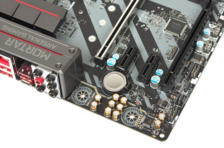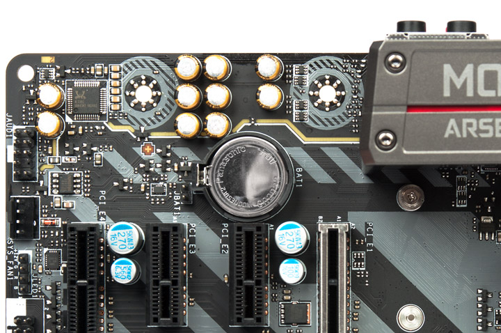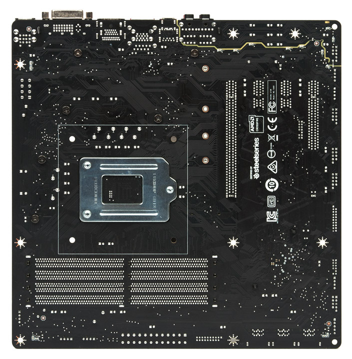 Размер продукта позволяет воспользоваться восемью точками крепления. Есть декоративный колпак над портами ввода-вывода у задней панели. Армирование присутствует только у главного гнезда PCI-E и нового M.2.